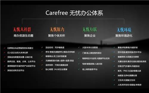 據房訊指數觀察,目前多家頭部企業已經積極擁抱數字化,推出智慧服務平臺,包括中海商務APP、華潤CR Union智慧云辦公平臺、大悅城COFFICE、金地商置Carefree辦公體系等。其中金地商置Carefree體系包含無憂大社群——企業資源生態圈、無憂原力——聚焦個體關懷、無憂互聯——聚焦企業生長、無憂健康——聚焦環境凈化四個模塊,26個細項。