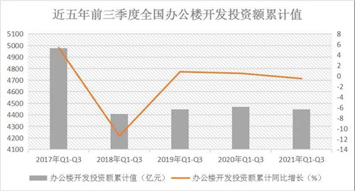 開發投資上,行業整體凸顯出理性發展的態勢,自2018年前三季度的辦公樓開發投資額大幅下滑之后,已經連續三年同期保持在1個百分點內的波動。2021年1-9月,全國辦公樓開發投資額為4446億元,較去年同期減少0.5%。
