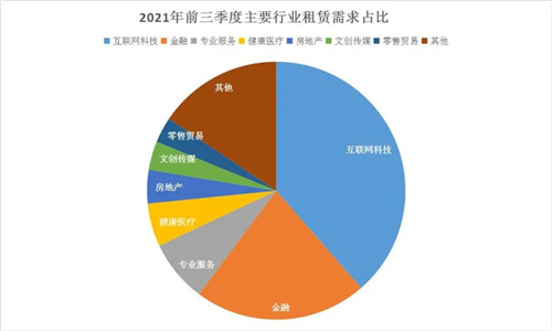 從北京市場來看,三季度,在北京寫字樓市場租賃成交中,高科技企業表現繼續活躍,成交占所有行業總成交面積的50.8%,其次為金融業和專業服務業,分別占成交總面積的20.8%和10.6%。截止到今年三季度,市場大宗租賃交易體量最大的十個交易中有6個是互聯網科技企業,且全部集中在行業頭部公司,包括華為、字節跳動等多家公司在北京市場均有擴張。從前三季度北京辦公樓市場的需求來看,互聯網科技企業的需求占比甚至要超過60%。