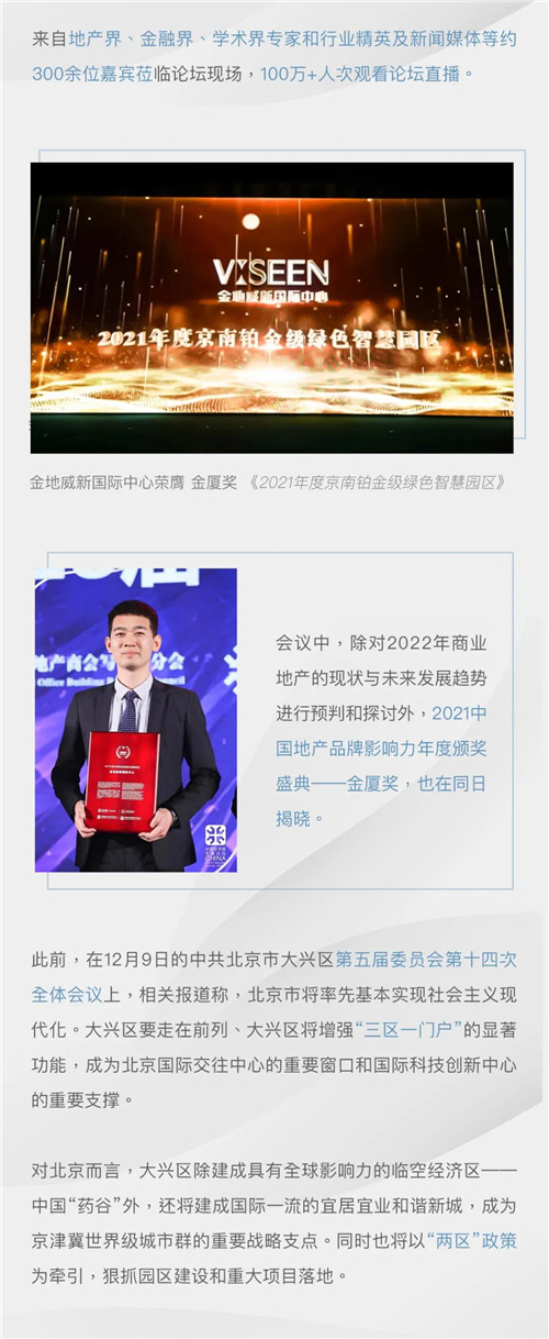 1月6日,中國寫字樓產業園發展論壇第十八屆年會在北京富力萬麗酒店舉行,論壇上除對2022年商業地產的現狀與未來發展趨勢進行預判和探討外,2021中國地產金廈獎也在同日揭曉,金地威新國際中心榮膺金廈獎“2021年度京南鉑金級綠色智慧園區”。