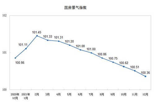 2021年12月份,房地產開發景氣指數(簡稱“國房景氣指數”)為100.36。