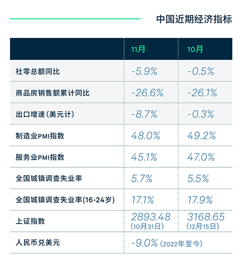 在防疫政策調整的同時,中國近期經濟下行壓力進一步增大。11月制造業PMI指數降至48%,連續兩個月位于榮枯線之下,社零總額同比下降5.9%,降幅相比10月明顯擴大,而地方政府財政收支也同樣面臨較大壓力。