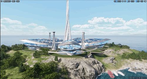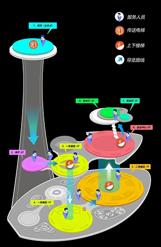 本次活動最大的亮點就是采用了線上元宇宙形式。元宇宙海島空間51ISLAND整體呈五瓣花造型,每個花瓣都是一個5.1萬平的獨立場館。共包含A、B、C、D、E五個館,本次活動采用了元宇宙A館,共有上下三層,劃分了七大功能區,包括序廳、1號展區、2號展區、會議中心、發布廳、貴賓廳以及活動廳。
