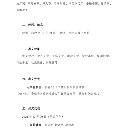 在此背景下,2022第六屆全裝修產業領袖峰會暨內裝工業化發展論壇將于12月29日舉辦,本屆峰會以“新周期?新動力 新標準”為主題,將采用線上元宇宙方式,與行業專家,業內領袖一起探討全裝修行業的新問題、新需求、新動向,共同推進中國房地產全裝修行業走綠色、舒適、健康發展之路。