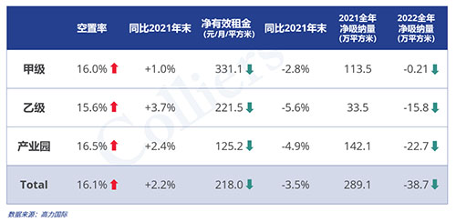 在供給側,原計劃在四季度入市的新項目均延遲到了2023年,全年核心甲級寫字樓市場僅有一個新項目入市,2022年的新增供應壓力大幅減小。