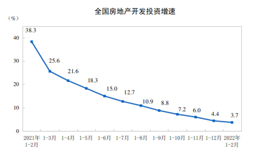 房訊網訊 據國家統計局數據,2022年1-2月份,全國房地產開發投資14499億元,同比增長3.7%。其中,住宅投資10769億元,增長3.7%;辦公樓投資665億元,下降1.5%;商業營業用房1242億元,下降0.7%。