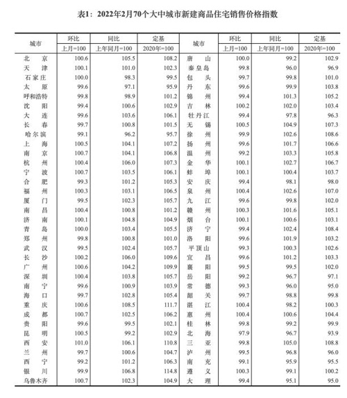 2022年2月70個大中城市新建商品住宅銷售價格指數。截圖自國家統計局官網