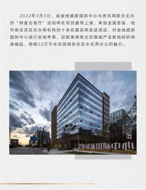 3月3日,由金地威新國際中心與房訊網聯合主辦的“財富會客廳”活動將在項目盛情上演,來自全國各省、地市商會及駐京辦等機構的十余名嘉賓將走進項目,對金地威新國際中心進行實地考察,近距離感受北京南城產業新地標的快速崛起,領略22萬平米花園商務社區中無界辦公的魅力。