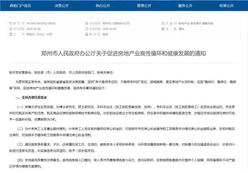 房訊網訊 3月1日,鄭州市發布《關于促進房地產業良性循環和健康發展的通知》,共從支持合理住房需求、改善住房市場供給、加大信貸融資支持、推進安置房建設和轉化、優化房地產市場環境等五方面提出19項措施,促進房地產業良性循環和健康發展。