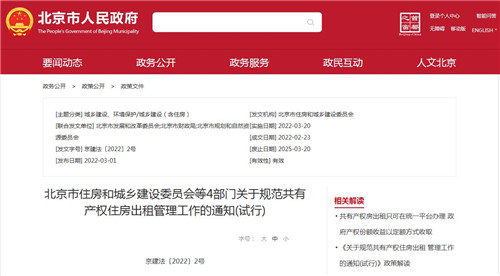 北京市住房城鄉建設委等四部門3月1日聯合印發《關于規范共有產權住房出租管理工作的通知(試行)》,3月20日起實施。