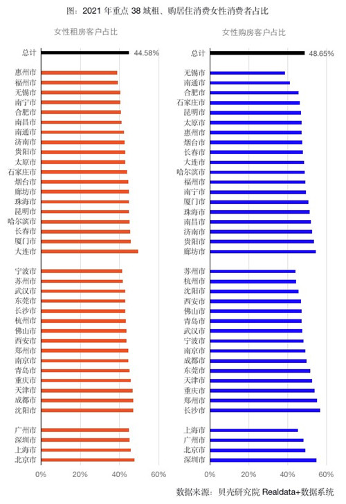 不過,不同城市之間存在差異,個別城市女性居住消費潛力不斷釋放,女性消費者占比提升較快。