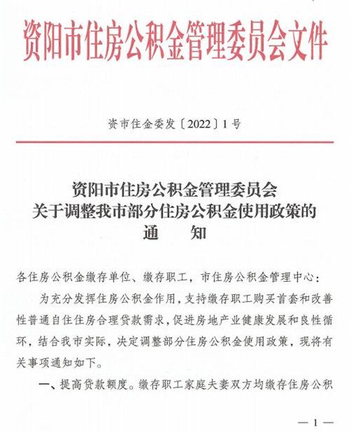 房訊網訊 近日,四川省資陽市發布《關于調整我市部分住房公積金使用政策的通知》,支持繳存職工購買首套和改善性普通自住住房合力貸款需求,促進房地產業健康發展和良性循環,結合本市實際,調整部分住房公積金使用政策。