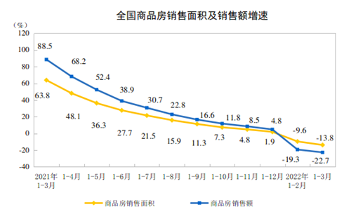 房訊網訊 據國家統計局最新數據,2022年1-3月份,全國商品房銷售面積31046萬平方米,同比下降13.8%;其中,住宅銷售面積下降18.6%,辦公樓銷售面積同比增長24.8%,商業營業用房銷售面積同比增長22%。