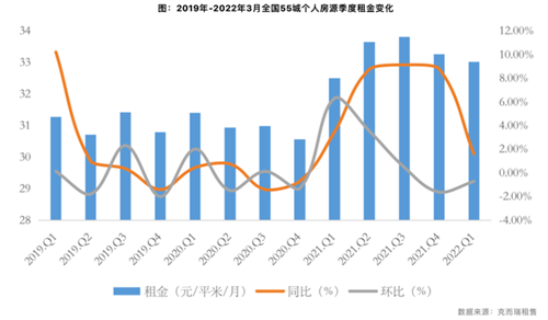 4月15日,據克而瑞租售監測數據顯示,2022年一季度,全國55城個人房源租金為33.02元/平方米/月,環比下跌0.72%,同比上漲1.6%,較2021年整體來看,租金上漲幅度明顯下降。