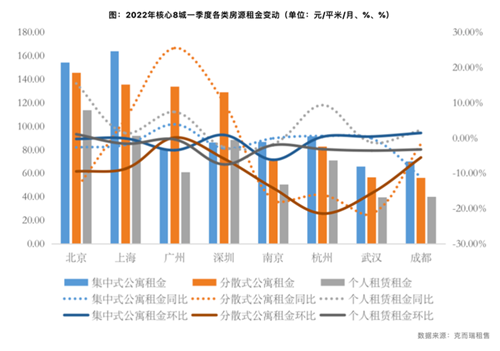 從房源類型來看,無論是集中式公寓還是分散式公寓,或是個人房源,今年一季度8城(即北京、上海、深圳、廣州、南京、杭州、武漢和成都)租金呈現普降趨勢。