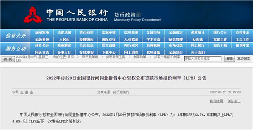 房訊網訊 中國人民銀行授權全國銀行間同業拆借中心公布,2022年4月20日貸款市場報價利率(LPR)為:1年期LPR為3.7%,5年期以上LPR為4.6%,已連續三個月維持不變。