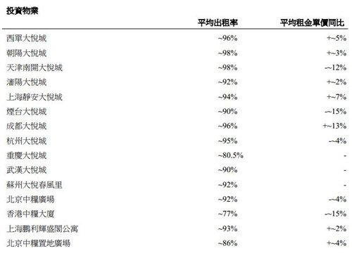 投資物業方面,目前大悅城地產旗下共有15處投資物業,包含了商業物業、寫字樓以及公寓等業態。除重慶大悅城、香港中糧大廈和北京中糧置地廣場外,大多數投資物業出租率在90%以上,其中朝陽大悅城和天津南開大悅城以98%的出租率領居于首位。從租金來看,香港中糧大廈和煙臺大悅城以平均租金單價波動較大,同比出現了15%的降幅;而成都大悅城則實現了平均租金單價同比13%的漲幅。