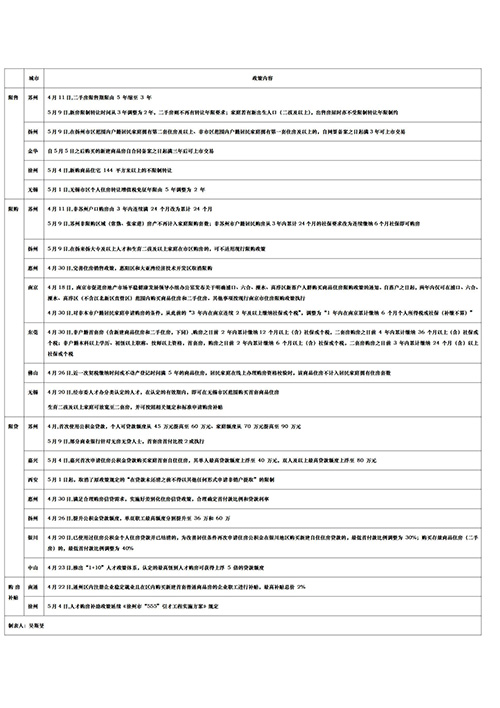 4月初,南京市促進房地產市場平穩健康發展領導小組辦公室發布通知,該通知放寬了部分地區的限購政策,即“自落戶之日起,兩年內僅可在浦口、六合、溧水、高淳區(不含江北新區直管區)范圍內購買商品住房和二手住房”;4月下旬,第一財經從多方核實,除六合、溧水等區外,棲霞、雨花臺等區域的部分板塊也放寬了限購,但未正式出臺文件;5月10日,據當地媒體消息,南京新房“限售”政策調整,新房“限售”時間從原來的辦證滿3年,調整為合同(備案)日期滿3年。政策調整后,新房的限售時間比原來縮短了1-3年。
