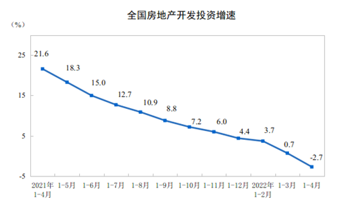 1—4月份,全國房地產開發投資39154億元,同比下降2.7%;其中,住宅投資29527億元,下降2.1%。