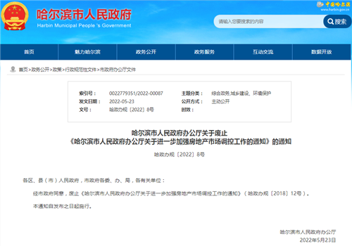 房訊網(wǎng)訊 5月23日,哈爾濱市人民政府發(fā)布通知稱,2018年出臺的《關于進一步加強房地產(chǎn)市場調(diào)控工作的通知》已完成其階段性調(diào)控使命,繼續(xù)實施區(qū)域性限售將導致一部分購房者購買的商品房無法上市交易,抑制了改善性購房需求的釋放,不利于哈爾濱市房地產(chǎn)市場發(fā)展的需要,因此予以廢止。即日起,購房人完成不動產(chǎn)權屬登記,取得不動產(chǎn)權證即可上市交易。