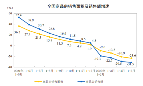 1—5月份,商品房銷售面積50738萬平方米,同比下降23.6%;其中,住宅銷售面積下降28.1%。商品房銷售額48337億元,下降31.5%;其中,住宅銷售額下降34.5%。