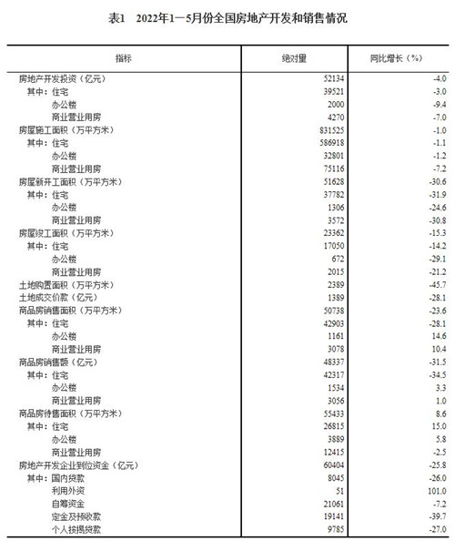 1—5月份,房地產開發企業房屋施工面積831525萬平方米,同比下降1.0%。其中,住宅施工面積586918萬平方米,下降1.1%。房屋新開工面積51628萬平方米,下降30.6%。其中,住宅新開工面積37782萬平方米,下降31.9%。房屋竣工面積23362萬平方米,下降15.3%。其中,住宅竣工面積17050萬平方米,下降14.2%。