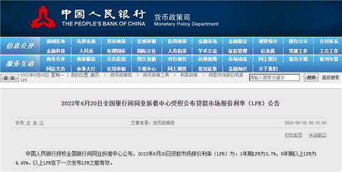 房訊網訊 中國人民銀行授權全國銀行間同業拆借中心公布,2022年6月20日貸款市場報價利率(LPR)為:1年期LPR為3.7%,5年期以上LPR為4.45%。以上LPR在下一次發布LPR之前有效。
