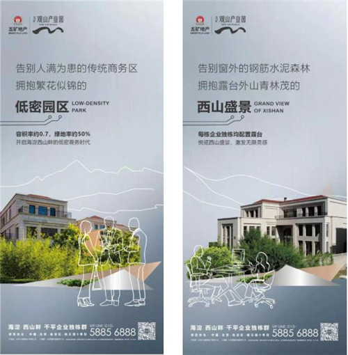 告別人滿為患的傳統商務區,擁抱繁花似錦的低密園區;告別窗外的鋼筋水泥森林,擁抱露臺外山青林茂的西山盛景;告別混雜辦公的高層寫字樓,擁抱獨立形象的企業獨棟;告別成本雖低/配套欠缺的遠郊,擁抱成本可控/配套完善的海淀硅谷……五礦觀山產業園的“告別是為了更好的擁有”系列廣告,在疫情之際走進了企業內心。