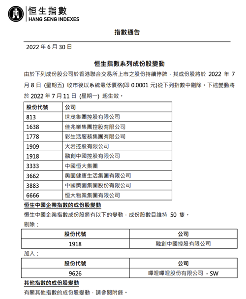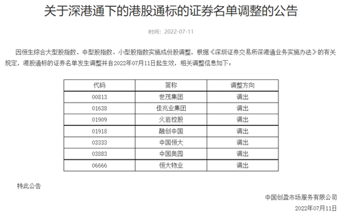 根據公告顯示,世茂集團、佳兆業集團、融創中國、火巖控股、中國恒大、中國奧園和恒大物業均被調出。