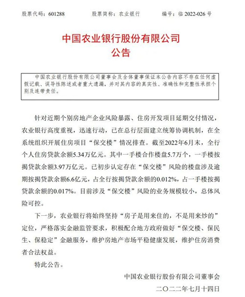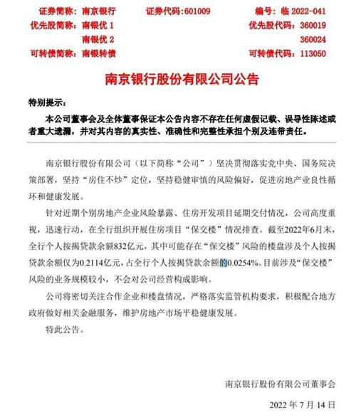 南京銀行稱,截至2022年6月末,南京銀行個人按揭貸款余額832億元,其中可能存在“保交樓”風險的樓盤涉及個人按揭貸款余額僅為0.2114億元,占南京銀行全行個人按揭貸款余額的0.0254%。目前涉及“保交樓”風險的業務規模較小,不會對南京銀行經營構成影響。