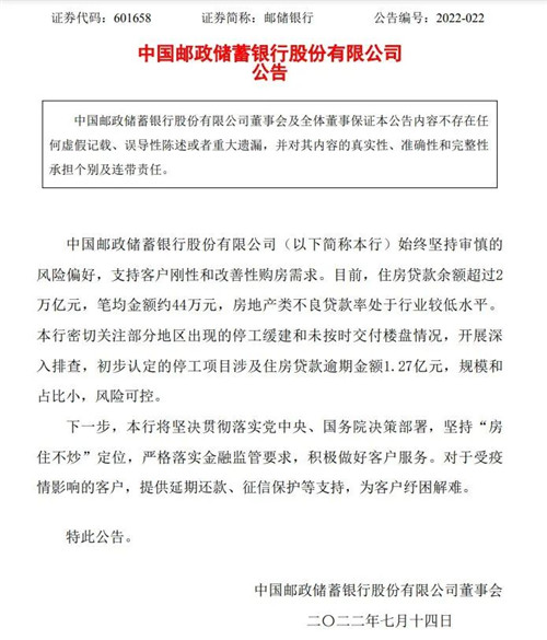 郵儲銀行稱,密切關注部分地區出現的停工緩建和未按時交付樓盤情況,開展深入排查,初步認定的停工項目涉及住房貸款逾期金額1.27億元,規模和占比小,風險可控。