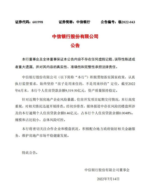 中信銀行發布公告稱,針對近期個別房地產企業風險暴露、住房開發項目延期交付情況,經初步排查,媒體報道中存在風險的樓盤所涉及的中信銀行逾期個人住房貸款余額0.46億元,占中信銀行個人住房貸款余額0.0048%,規模和占比較小,總體風險可控。