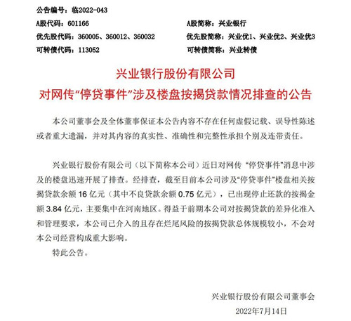興業銀行稱,經排查,截至目前興業銀行涉及“停貸事件”樓盤相關按揭貸款余額16億元(其中不良貸款余額0.75億元),已出現停止還款的按揭金額3.84億元,主要集中在河南地區。得益于前期興業銀行對按揭貸款的差異化準入和管理要求,興業銀行已介入的且存在爛尾風險的按揭貸款總體規模較小,不會對興業銀行經營構成重大影響。
