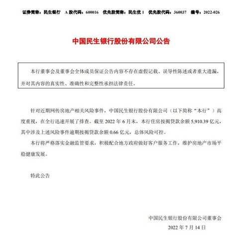 民生銀行稱,針對近期網傳房地產相關風險事件,民生銀行迅速開展了排查。截至2022年6月末,民生銀行住房按揭貸款余額5910.39億元,其中涉及上述風險事件逾期按揭貸款余額0.66億元,總體風險可控。