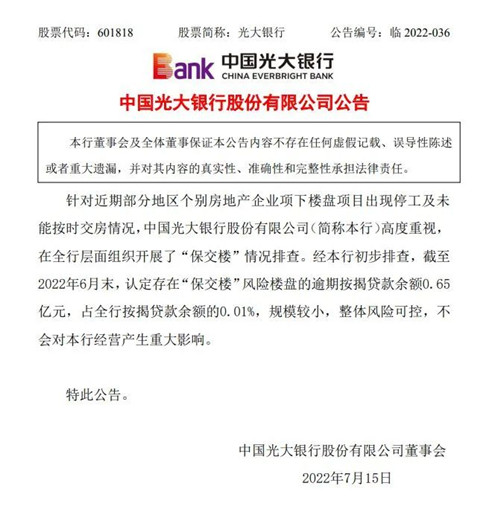 光大銀行稱,經光大銀行初步排查,截至2022年6月末,認定存在“保交樓”風險樓盤的逾期按揭貸款余額0.65億元,占光大銀行全行按揭貸款余額的0.01%,規模較小,整體風險可控,不會對光大銀行經營產生重大影響。
