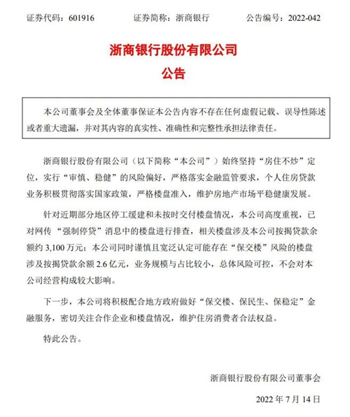 浙商銀行稱,已對網傳 “強制停貸”消息中的樓盤進行排查,相關樓盤涉及浙商銀行按揭貸款余額約3100萬元;浙商銀行同時謹慎且寬泛認定可能存在“保交樓”風險的樓盤涉及按揭貸款余額2.6億元,業務規模與占比較小,總體風險可控,不會對浙商銀行經營構成較大影響。