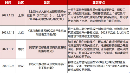 目前北京、上海、武漢、深圳已經開始出臺相關政策,推動建筑領域進入碳交易平臺。