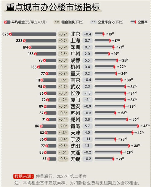 房訊網(wǎng)訊 2022上半年疫情多點散發(fā),對經(jīng)濟運行和商務(wù)活動造成一定程度的擾動,從而影響各地辦公樓市場表現(xiàn)。仲量聯(lián)行近日發(fā)布第二季度中國40城辦公樓市場指數(shù)顯示,全國大部分辦公樓市場表現(xiàn)低迷,增量需求回落,各地租金均有不同程度下滑。