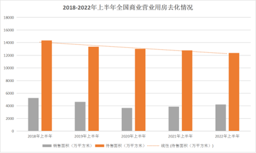綜合五年同期數據來看,全國商業營業用房新開工面積呈現出明顯的逐年下降趨勢,且降幅逐年擴大。2022年上半年新開工面積為4535萬平方米,同比下降35%,較2018年同期的9218萬平方米減少了超過五成。竣工面積同樣出現較大的降幅,2022年上半年全國商業營業用房竣工面積為2369萬平方米,同比下降30.3%,較2018年同期(4753萬平方米)下降過半,降幅為50.1%。