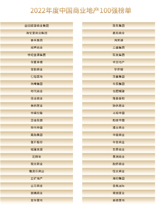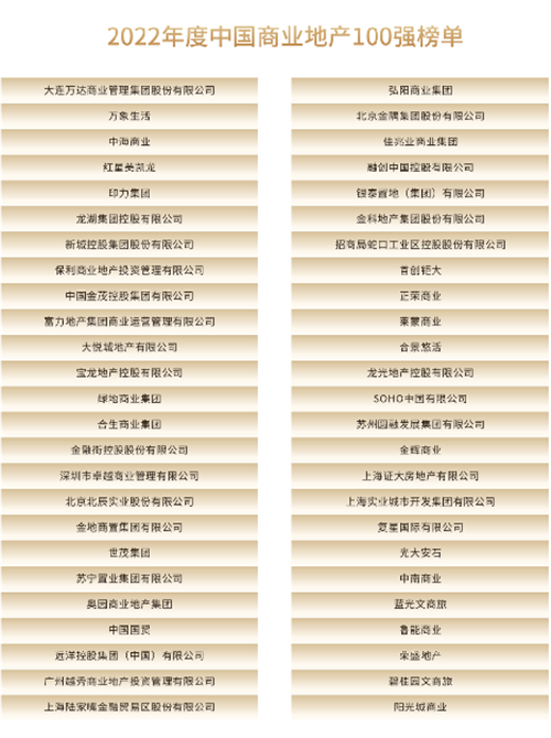 發布會上,備受關注的“中國商業地產100強”測評榜單揭曉。其中,萬達商管繼續占據榜首位置,華潤萬象生活和中海商業分列二、三位,第四到第十位則分別是紅星美凱龍、印力集團、龍湖集團、新城控股、保利商業、中國金茂、富力地產。