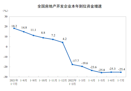 1—7月份,房地產(chǎn)開發(fā)企業(yè)到位資金88770億元,同比下降25.4%。其中,國內(nèi)貸款11030億元,下降28.4%;利用外資53億元,增長20.7%;自籌資金31495億元,下降11.4%;定金及預(yù)收款28575億元,下降37.1%;個人按揭貸款14169億元,下降25.2%。