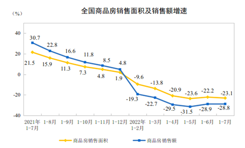 1—7月份,商品房銷售面積78178萬平方米,同比下降23.1%,其中住宅銷售面積下降27.1%。商品房銷售額75763億元,下降28.8%,其中住宅銷售額下降31.4%。