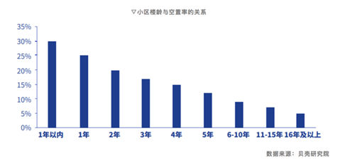 報告指出,從微觀層面看,樓齡和物業類型是影響小區空置率的兩大因素。就房屋本身的屬性來看,住房空置率隨著小區樓齡的增長逐漸變低。5年以內樓齡的小區,空置率隨樓齡的增長從30%依次遞減至12%;15年以上樓齡的小區空置率沒有明顯差異。