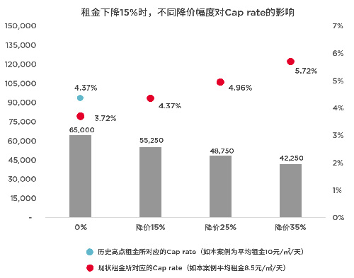假定以一棟前幾年市場高點年購入的市中心寫字樓為例,購入后平均租金10元,之前售價6.5萬元/㎡,Cap rate約4.37%。該項目到了現在,平均租金跌幅為15%,當單價下降15%時則對Cap rate沒有實質影響;當單價下降25%時,Cap rate提升至4.96%(只略低于目前市場投資者回報要求);當單價下降35%時,Cap rate由4.37%提升至5.72%,該收益率已經超過投資者回報要求,具備極大投資潛力吸引投資者。