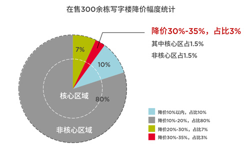 根據戴德梁行資本市場部統計,目前市場在售的上海約300棟寫字樓中,調整幅度分布如下圖: