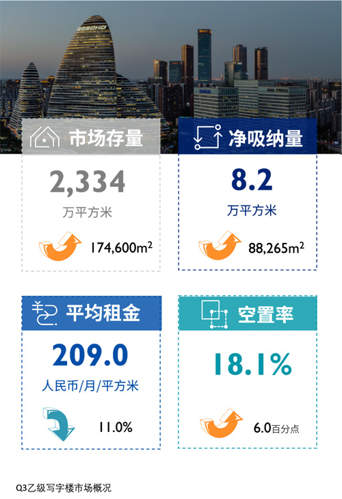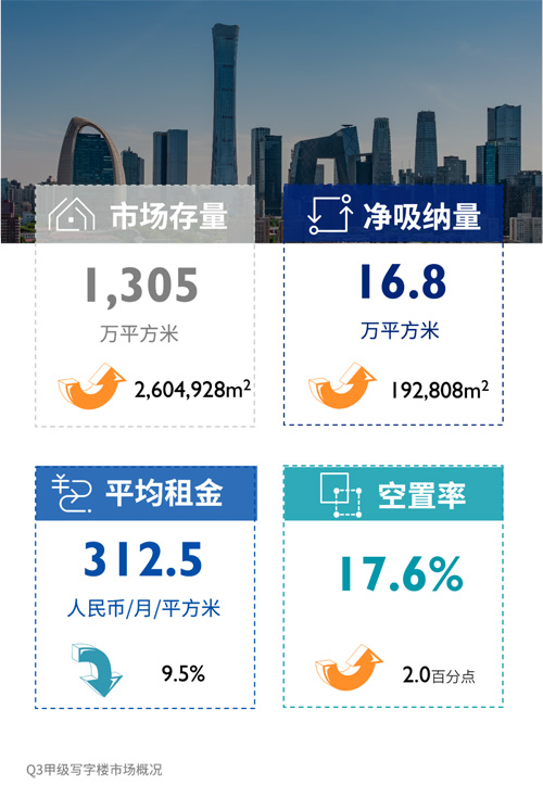 第三季度甲級寫字樓由于幾個新項目集中入市增加413,500平方米的租賃面積,使空置率升至17.6%,和上半年的企業退租和縮面積引發的空置率升高略有不同之處,是本季度由于幾個新項目的入市,促使空置率繼續升高。