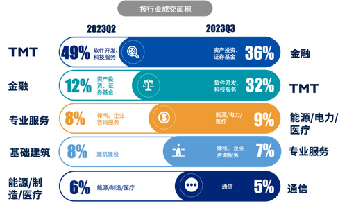 按行業劃分的租賃活動中,以金融行業為首,占36%,照二季度占比上升;TMT行業占據了32%的第二大份額,相較上個季度有所下降;能源電力醫療行業以9%的占比排列第三。相較于上季度,麗澤商圈在2023年前9個月的成交面積相當于其他商圈突飛猛進,成交面積錄得16%,是本季度成交面積最多的核心商圈。