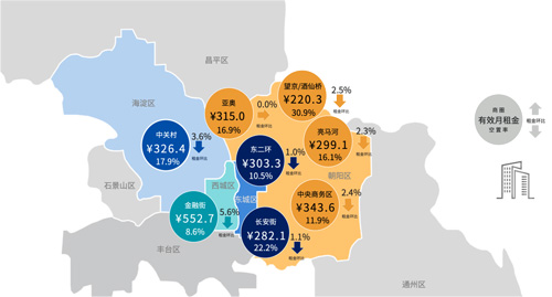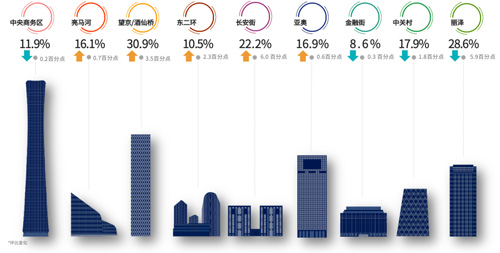 第四季度將有中關村麗金置地中心入市,給中關村的實力企業帶來升級換代的項目機遇;除此之外,上地、望京、亞奧、麗澤商圈均有新項目四季度,市場供應將以城市更新項目為主,帶來超過50萬平方米的辦公面積。和第三季度新入市項目不同,相比而言這些項目預租情況表現一般,所以無法引發有效的凈吸納將進一步拉升空置率,將極有可能導致第四季度的空置率再次拉升。