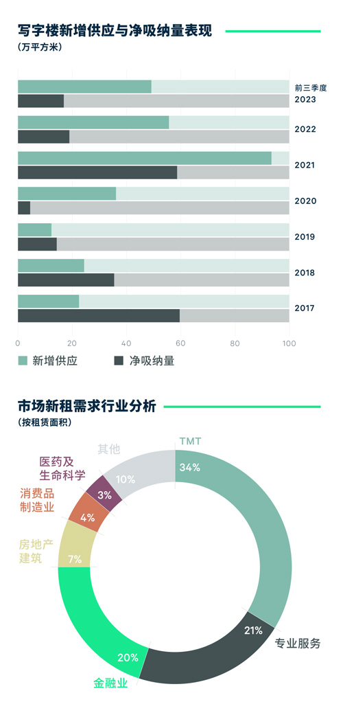 2023年第三季度,全市錄得兩個項目,共計10.6萬平方米的新增供應進入市場,前三季度累計供應量49.2萬平方米,同比增長61.5%。位于琶洲和國際金融城的新項目入市,帶動業主自用以及關聯企業升級進駐,預租總面積超過4萬平方米。全市空置率在過去四個季度持續上揚后,第三季度凈吸納量環比增長了42%,達到了9.4萬平方米,支撐本季空置率環比保持穩定,季末報17.5%。
