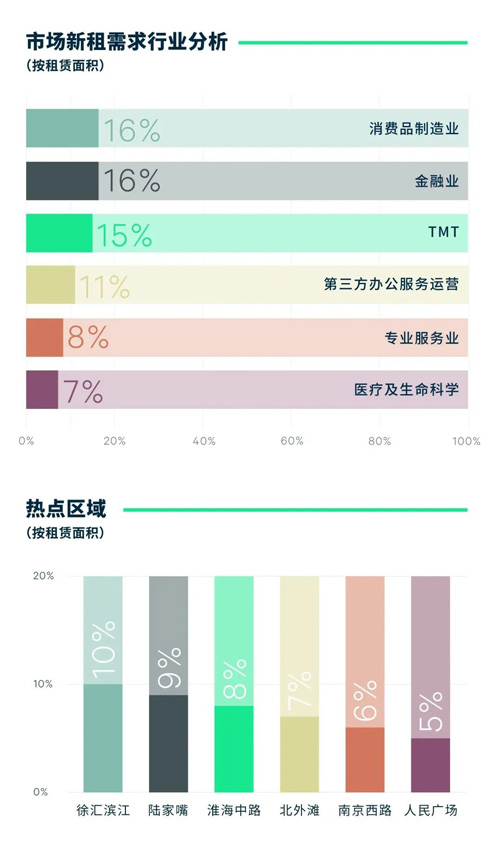 從行業(yè)需求來(lái)看,消費(fèi)品制造業(yè)需求提速明顯,升至首位,占比15.9%,其中以服飾及汽車(chē)相關(guān)企業(yè)的租賃需求占比最為突出;金融行業(yè)需求位居第二,其中保險(xiǎn)及投資等類(lèi)別的需求占比較高;TMT行業(yè)位居第三,占比15.2%,主要以軟件科技企業(yè)的租賃需求為主;第三方辦公服務(wù)進(jìn)一步布局,租賃需求穩(wěn)中有升;生物醫(yī)藥行業(yè)和專(zhuān)業(yè)服務(wù)業(yè)的需求占比小幅下降。區(qū)位表現(xiàn)上,徐匯濱江去化表現(xiàn)優(yōu)異,陸家嘴區(qū)域需求回暖,四川北路及黃浦濱江的租賃需求相對(duì)較為低迷。從成交面積段來(lái)看,1,000平方米以下的占比超過(guò)半數(shù);企業(yè)性質(zhì)及交易類(lèi)型來(lái)看,內(nèi)資需求在租賃成交中仍然占據(jù)過(guò)半比例,外資機(jī)構(gòu)擴(kuò)張勢(shì)頭相對(duì)不足;新設(shè)立的租賃需求下降,企業(yè)搬遷需求明顯增加,同時(shí)伴隨一部分的縮減面積續(xù)租。